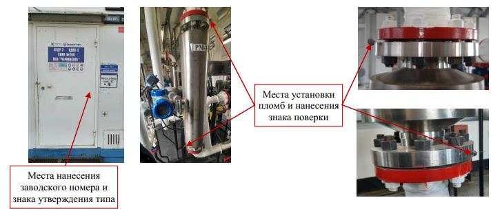 Для исключения возможности несанкционированного вмешательства, которое может повлиять на результат измерений, на фланцевых соединениях РМ предусмотрены места для установки пломб. Пломбировка осуществляется нанесением знака поверки давлением на свинцовые (пластмассовые) пломбы, установленные на контровочных проволоках, пропущенных через отверстия в шпильках, расположенных на диаметрально противоположных фланцах, согласно рисунку 2.