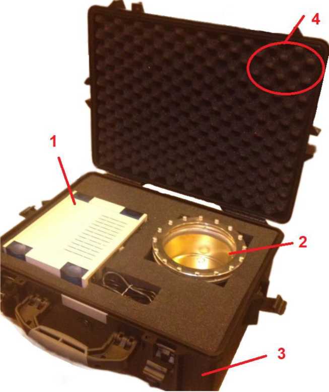 1 - барометр, 2 - герметичная камера давления (бароблок), 3 - кейс для хранения и перевозки, 4 - место нанесения заводского номера и знака утверждения типа (на пластике кейса под подкладкой)