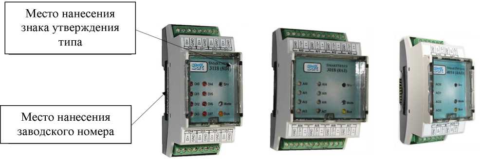 Общий вид контроллеров, места нанесения знака утверждения типа, места нанесения заводского номера представлен на рисунке 1. Нанесение знака поверки на контроллеры предусмотрено. Пломбирование мест настройки (регулировки) контроллеров не предусмотрено.