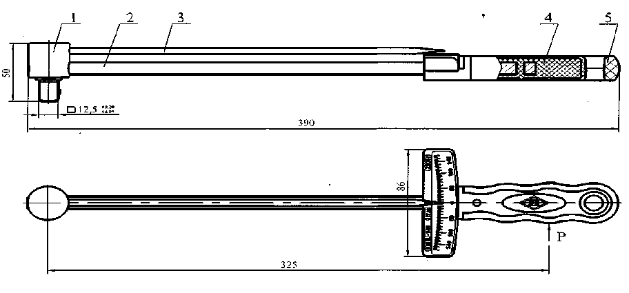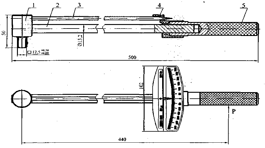 1 - головка; 2 - стержень; 3 - стрелка; 4 - шкала; 5 - втулка, Р - точка приложения усилия