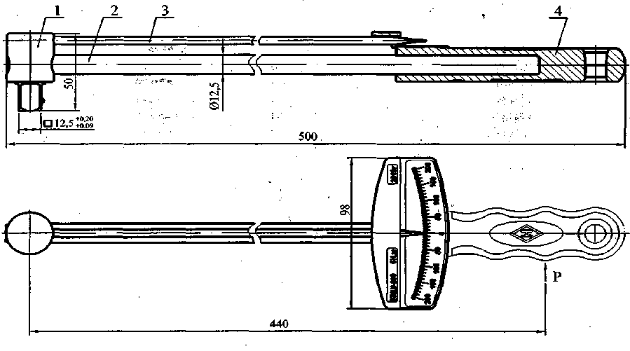 1 - головка; 2 - стержень; 3 - стрелка; 4 - рукоятка; Р - точка приложения усилия