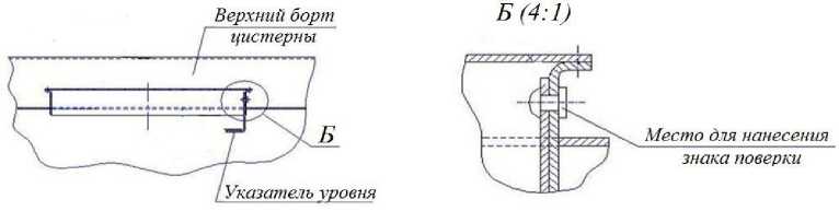 Знак поверки наносится на заклепку, проходящую через стенку горловины и указатель уровня налива, и на свидетельство о поверке.