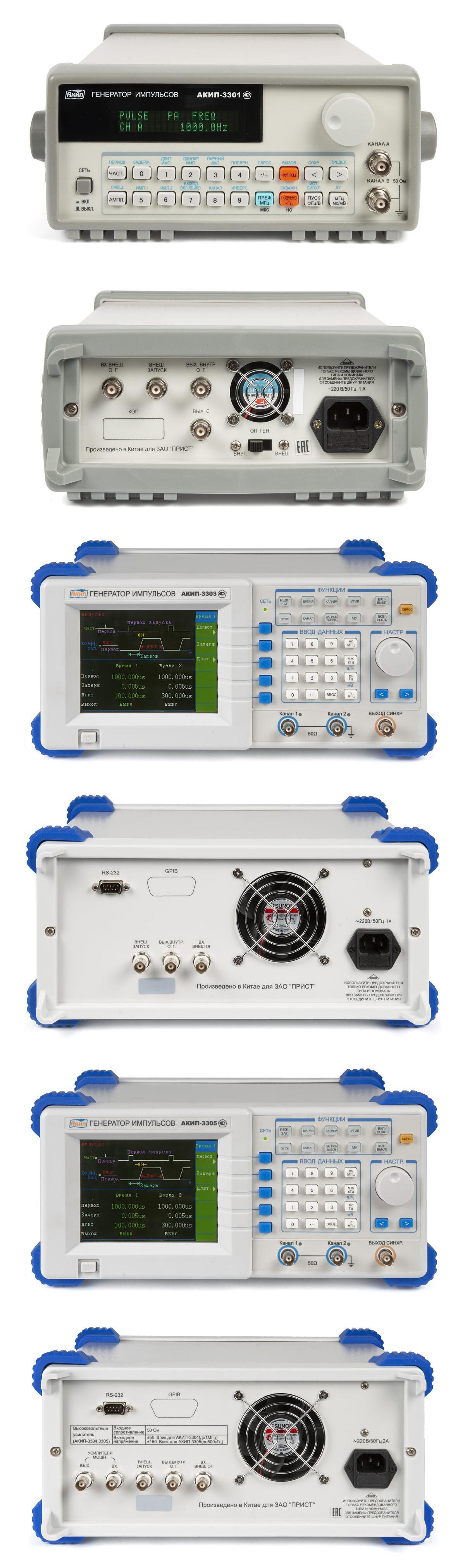 Модификации генераторов отличаются числом каналов с регулируемыми параметрами, расположением органов управления, типом индикатора и усилителем мощности (модификации АКИП-3304, АКИП-3305).