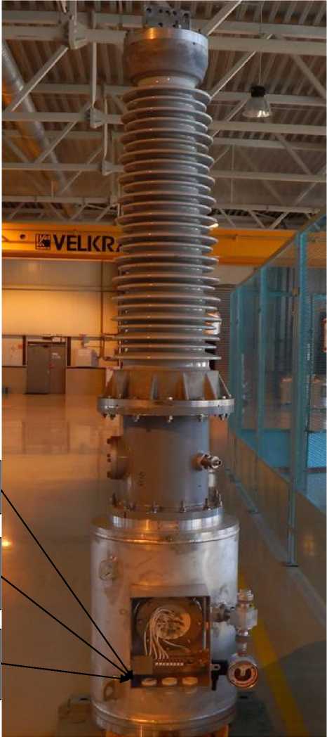 На корпусе установлен изолятор, обеспечивающий внешнюю изоляцию трансформатора. На верхнем торце изолятора размещен высоковольтный зажим первичной обмотки. На корпусе расположены заземляемый вывод первичной обмотки, выводы вторичных обмоток, сигнализатор плотности для определения давления элегаза, устройство для заполнения элегазом, предохранительный клапан с разрывной мембраной, табличка технических данных.