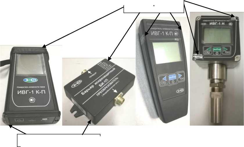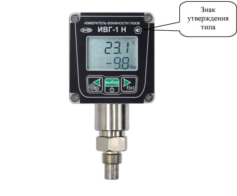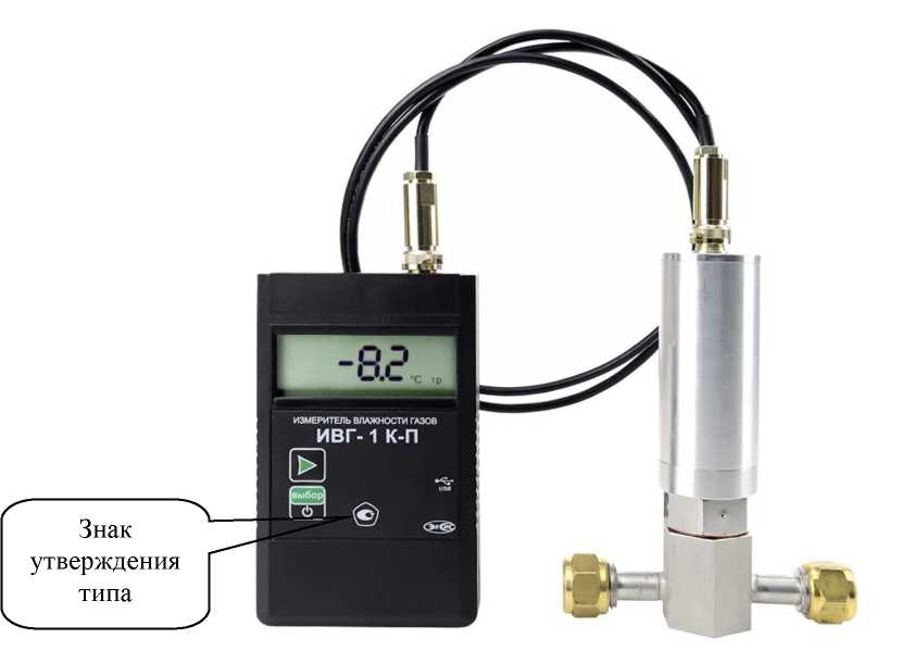 Маркировка прибора выполнена на корпусе печатным способом и содержит: обозначение - Измерители влажности газов ИВГ-1; знак утверждения типа, фирменный знак предприятия изготовителя, заводской номер в формате не менее 5-ти арабских цифр по принятой нумерации предприятия-изготовителя и другие параметры.