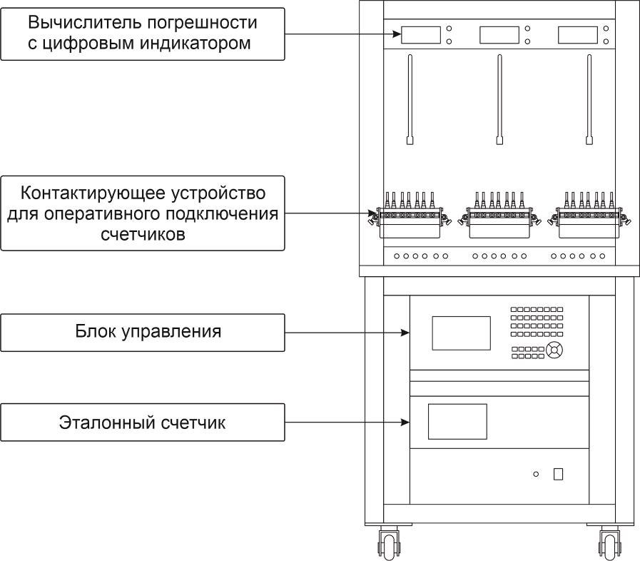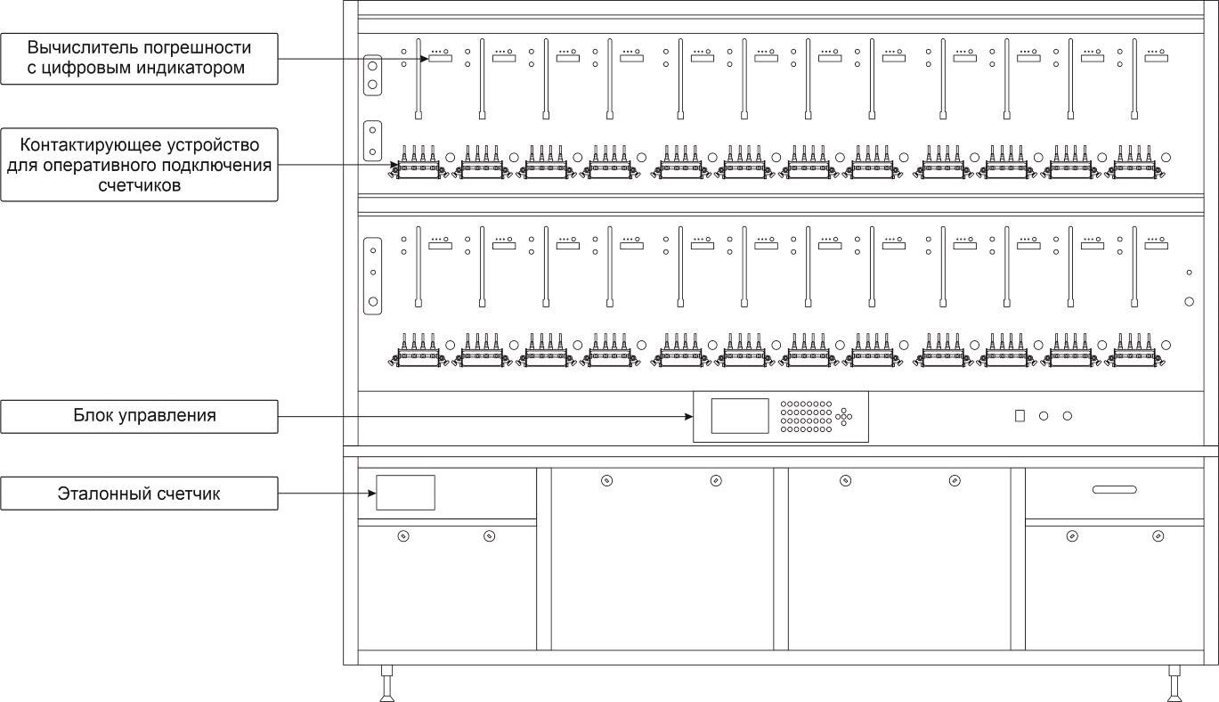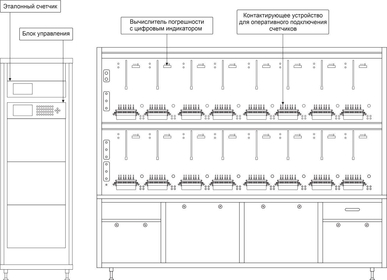 Установки стационарного раздельного исполнения выполнены из стойки, содержащей БУ и ПИС, и стенда (или стендов) для навески счетчиков.