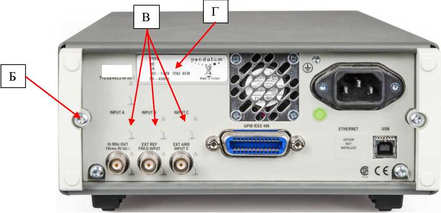 Рисунок 2 - Вид задней панели частотомеров, схема пломбировки от несанкционированного доступа (Б), место установки измерительных входов (опция 11/90 (В) и место размещения наклейки с серийным номером (Г)