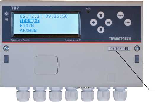 на лицевую панель тепловычислителя ТВ7 теплосчётчика методом шелкографии, вносится на титульный лист паспорта теплосчётчика типографским способом.