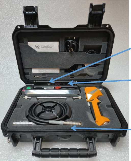Доступ к элементам конструкции защищен наклейками, саморазрушающимися при вскрытии, нанесенными на крепежные винты корпуса течеискателя.