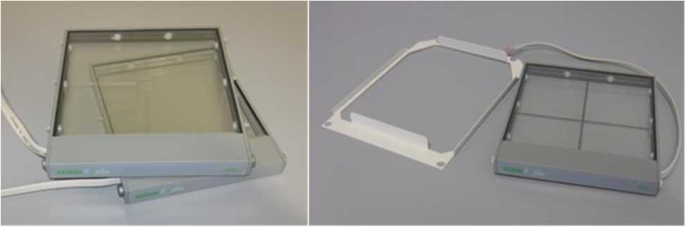 Ионизационная камера измерителя KermaX-plus 120-131 устанавливается на штатное место формирователя поля излучения рентгеновского аппарата. Размер сечения пучка излучения в плоскости камеры не должен превышать размеры активной области камеры. Активная область камеры стандартного размера имеет площадь 140 мм х 140 мм, камеры компактного размера -115 мм х 115 мм. Направление пучка падающего излучения должно быть перпендикулярно поверхности камеры.