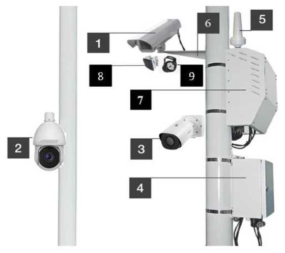 Комплексы состоят из распознающей видеокамеры, обзорных видеокамер, вычислительного модуля, блока питания, приемника временной синхронизации, инфракрасного прожектора, радиолокационного модуля и установочного комплекта.