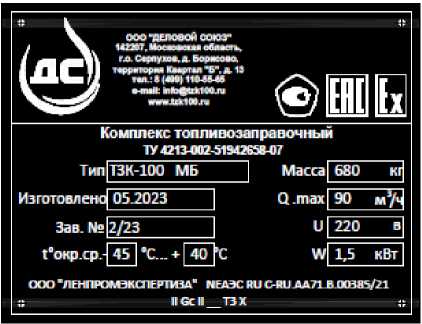 ТУ 4213-002-51942658-07 «Комплекс топливозаправочный ТЗК-100ХХХХХХ.