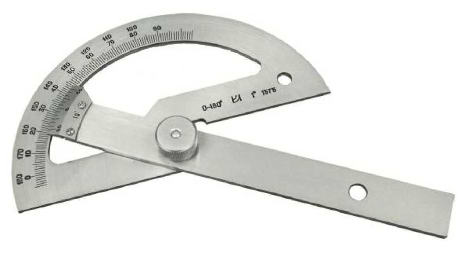 Угломер состоит из основания, которое представляет собой полудиск со шкалой углов (основная шкала). На оси основания установлена линейка с нониусом, которая закрепляется в требуемом положении стопорной гайкой.