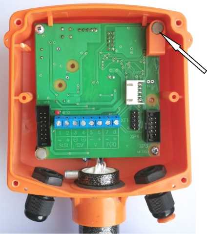 Пломбировка преобразователей осуществляется нанесением знака поверки давлением на мастику, расположенной в защитном колпачке, внутри корпуса электронного блока, на крепежном винте платы преобразователя. Схема пломбировки от несанкционированного доступа, обозначение места нанесения знака поверки представлены на рисунке 2.