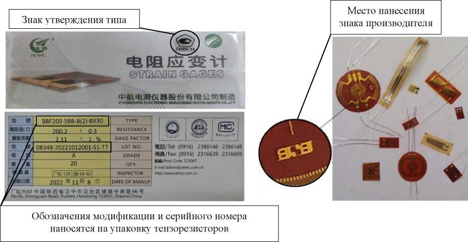 Рисунок 1 - Общий вид тензорезисторов, обозначение мест нанесения серийных номеров, цифровых обозначений модификаций, знака производителя и знака утверждения типа