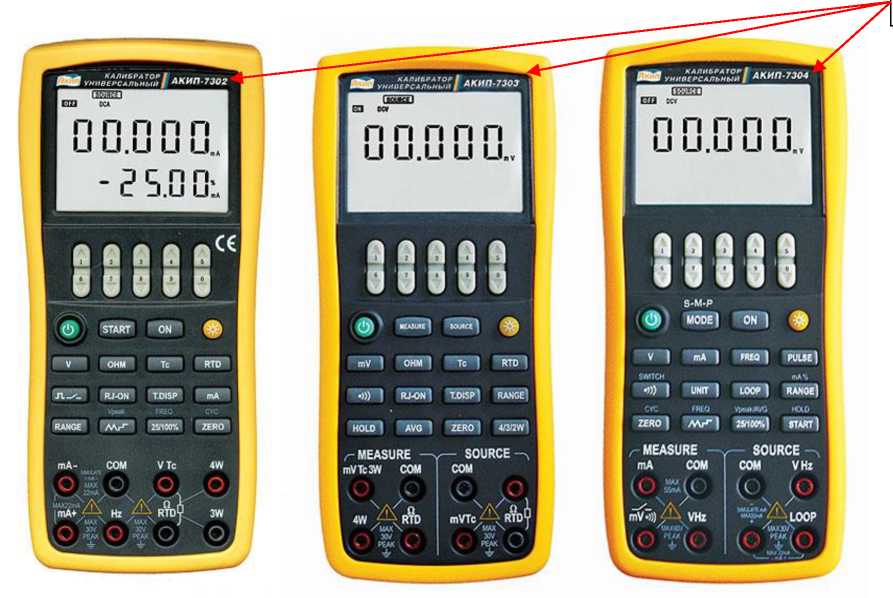Калибраторы выпускаются в виде моделей АКИП-7302, АКИП-7303, АКИП-7304, которые отличаются числом воспроизводимых и измеряемых величин. Модель АКИП-7302 имеет только режим имитатора (источник сигналов); модель АКИП-7303 имеет режим измерителя и имитатора термопар и термопреобразователей сопротивления; модель АКИП-7304 имеет режим измерителя и имитатора постоянного напряжения и силы постоянного тока, токовой петли и измеритель давления с использованием внешних модулей давления типа АРМ.
