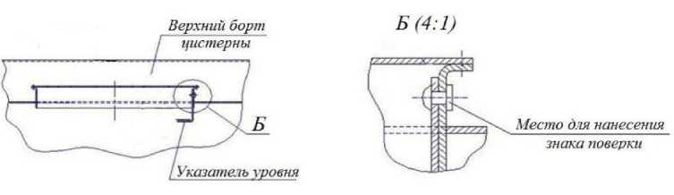 Знак поверки наносится на заклепку, проходящую через стенку горловины и указатель уровня налива, и на свидетельство о поверке.