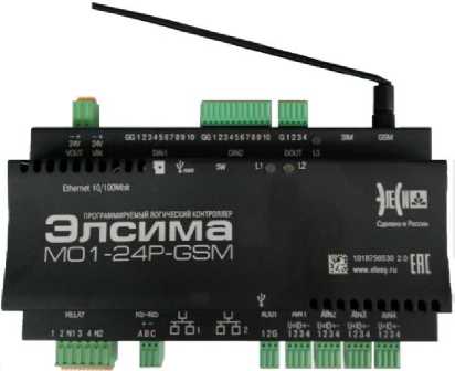 ПЛК выпускаются в следующих модификациях: Элсима-М01-24Р и Элсима-М01-24Р-GSM, где GSM встроенный модем и отличаются количеством разъемов.