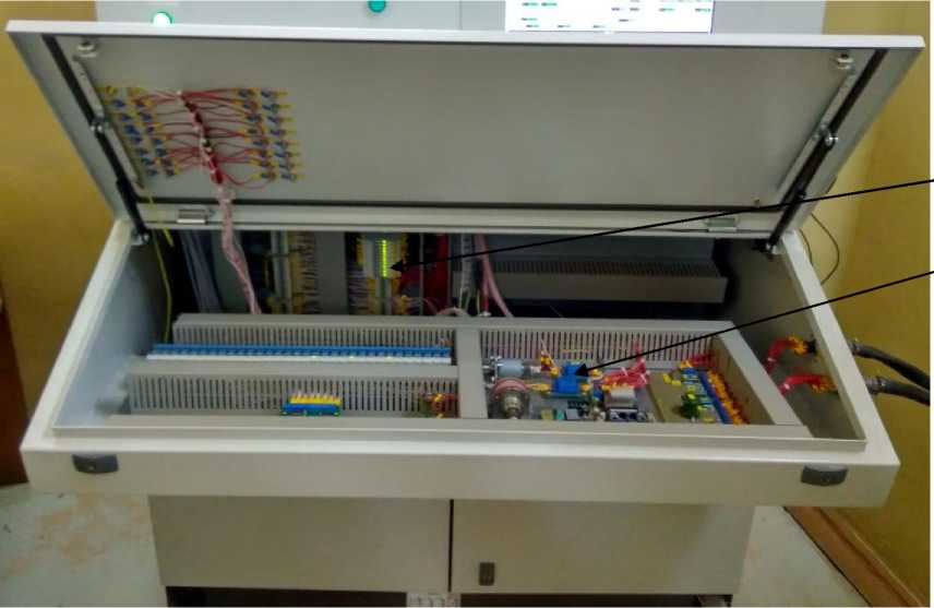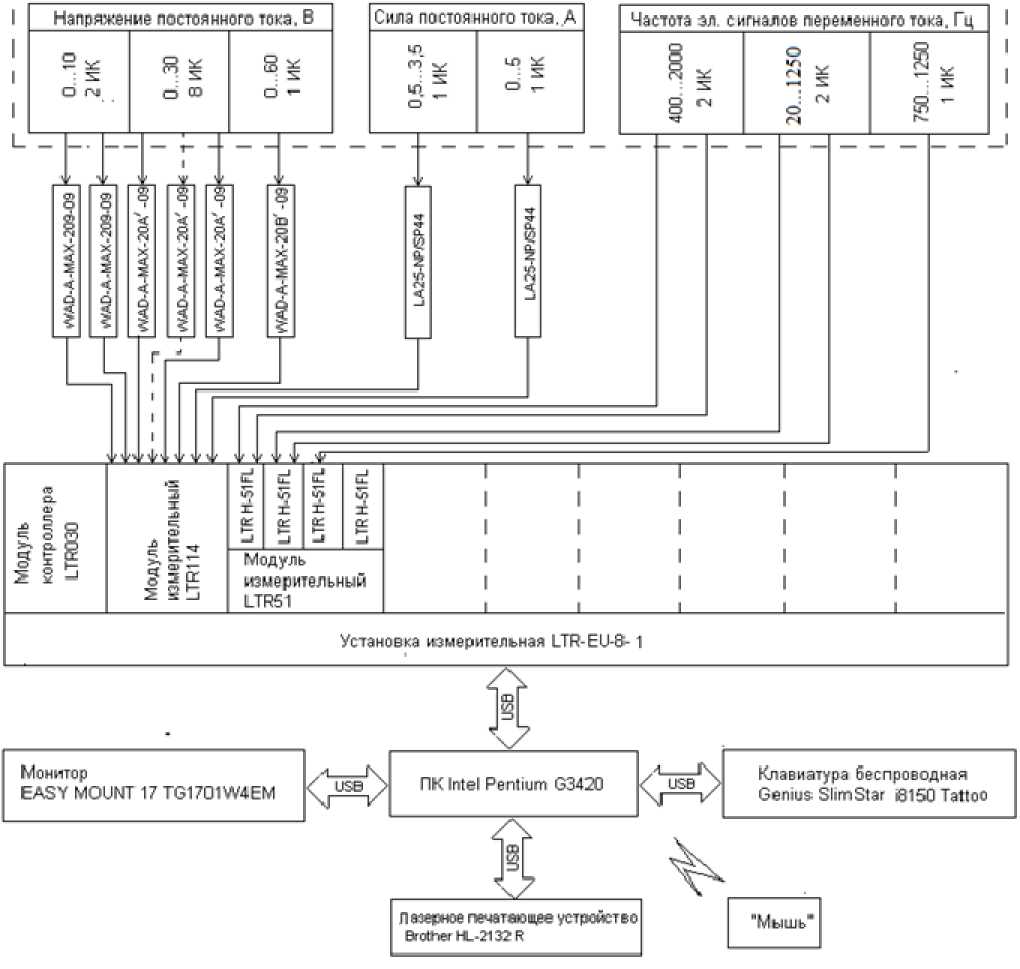 - пульт управления (ПУ) с тремя приборными отсеками (верхний, средний и нижний), содержащими: установку измерительную LTR (регистрационный номер (далее - рег. №) 35234-15 в Федеральном информационном фонде); комплект ПИП, содержащий датчики тока серии L (рег. № 57086-14) и модули электронные WAD (рег. № 68657-17); ПК на базе процессора Intel Pentium G3420; встроенный в переднюю панель ПУ сенсорный резистивный монитор EASY MOUNT 17 TG1701W4EM; источник бесперебойного питания EATON Evolution 650; источники питания постоянного тока с регулируемым и нерегулируемым выходным напряжением; расположенные на горизонтальных панелях ПУ беспроводную клавиатуру с манипулятором типа «мышь» Genius Slim Star 18150 и лазерное печатающее устройство Brother HL-2132;