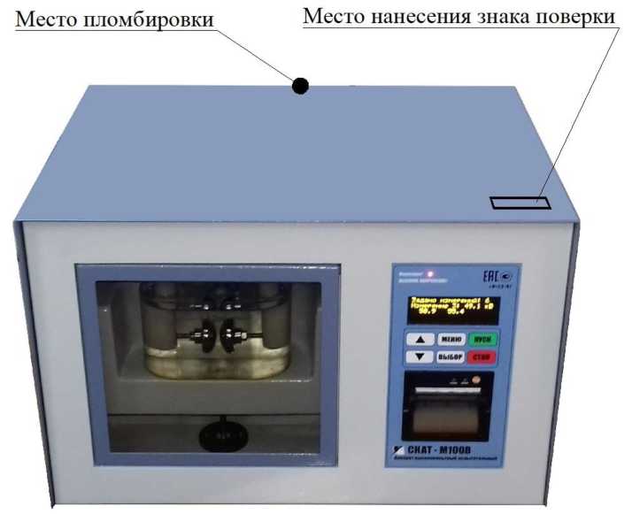 Общий вид аппаратов высоковольтных испытательных СКАТ-М100В с указанием места пломбировки и места нанесения знака поверки представлен на рисунке 1.