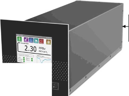 Генерируемое лазерное излучение поступает в резонатор и многократно отражается от расположенных внутри зеркал. Каждый раз, отражаясь от выходного зеркала, излучение частично покидает резонатор и регистрируется полупроводниковым приемником. В результате обработки поступающего с приемника сигнала определяется время затухания излучения, которое обратно пропорционально содержанию HCN в анализируемой пробе газовой смеси. На входе газовой пробы в газоанализатор расположен фильтр для очистки от пыли.