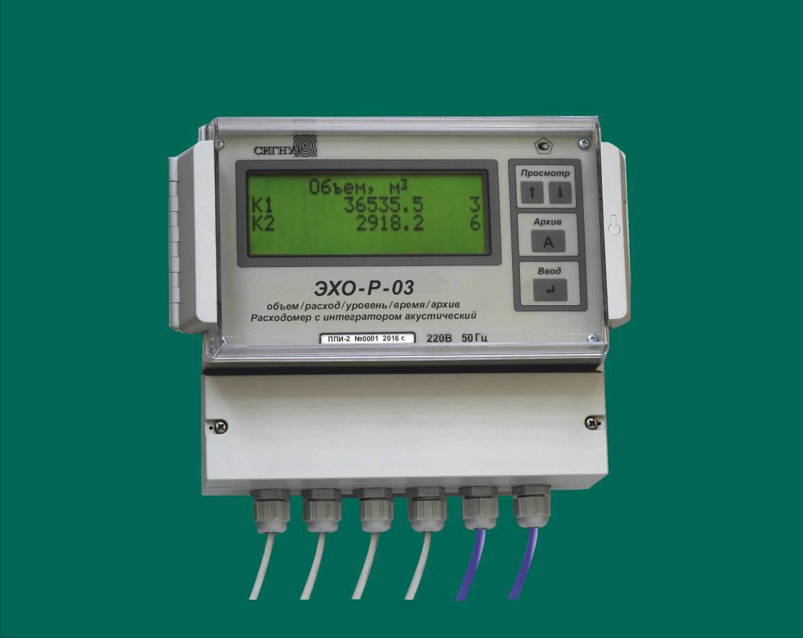 - ЭХО-Р-03-2 - для измерений объемного расхода и суммарного объема в двух водоводах прямоугольного, U-образного или круглого сечения одновременно (двухканальный) при свободном истечении потока; включает в себя преобразователь передающий измерительный ППИ-2 и два акустических преобразователя АП-11 или АП-13, устанавливаемых на разных водоводах;