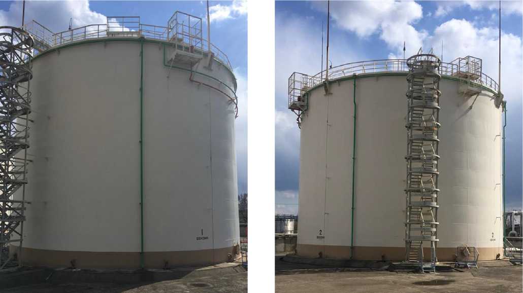 Резервуары представляют собой металлические сосуды в форме вертикального цилиндра, со стационарной крышей. На боковых стенках и крышах предусмотрены люки-лазы для обслуживания резервуаров, а также смотровые, монтажные и замерные люки. Днища резервуаров металлические. Резервуары снабжены лестницами для доступа на крыши и оборудованы теплоизоляцией.