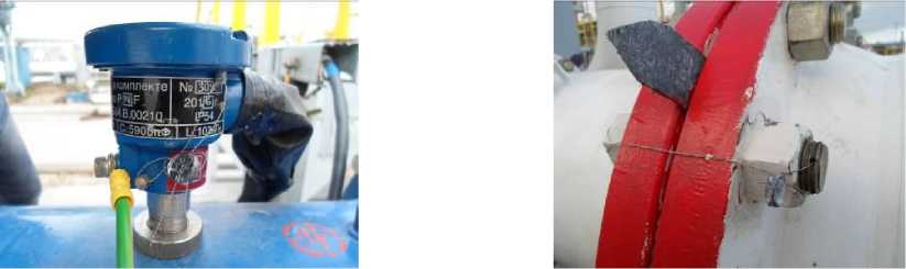 Для исключения возможности несанкционированного вмешательства, которое может повлиять на результат измерений, конструкцией ТПР предусмотрены места установки пломб, несущих на себе оттиск клейма поверителя (две диаметрально противоположно установленные шпильки на фланцевых соединениях, крышка магнитоиндукционного датчика). Места установки пломб указаны на рисунке 2.