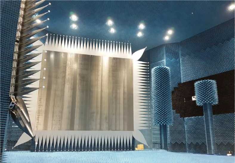 Рисунок 2 - Общий вид основного зеркала (по центру) и облучающей системы (справа) в радиобезэховой экранированной камере ТМ ЭК 42.0х28.3х18.0