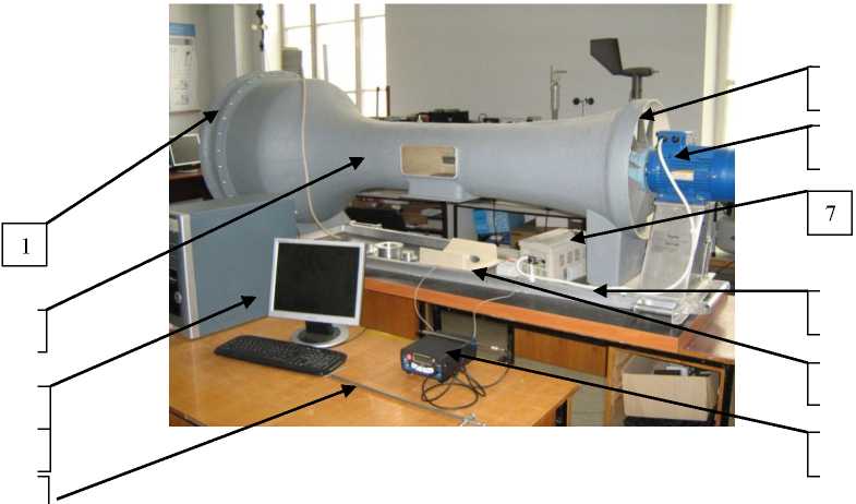 1- Входной участок с сеточными фильтрами, 2 - корпус, 3 -ПК, 4 - трубка Пито, 5 - вентилятор, 6- электродвигатель,7 - преобразователь частоты, 8 - рама, 9 - дифманометр ДМЦ-01М, 10-лимб, 11 - анемометр ЭА-70