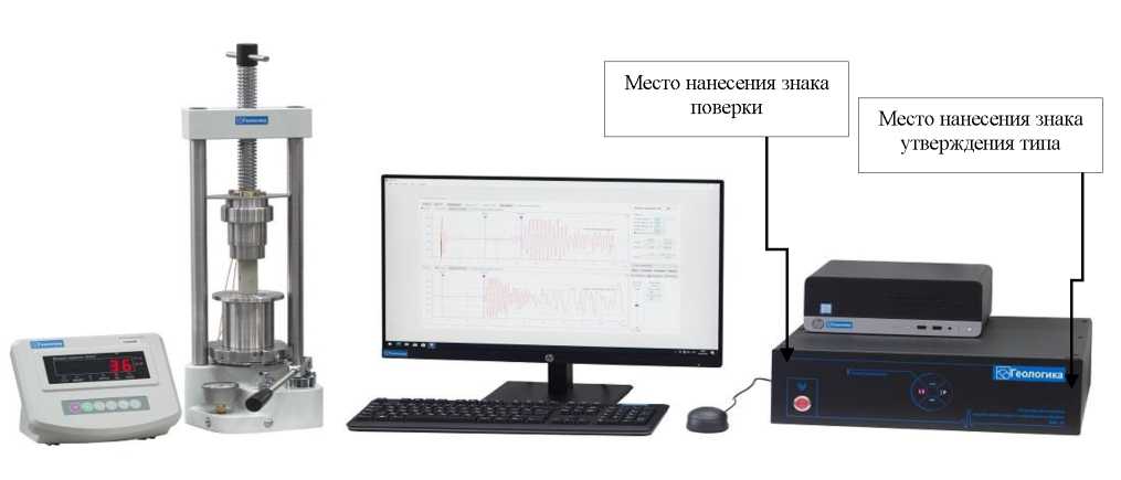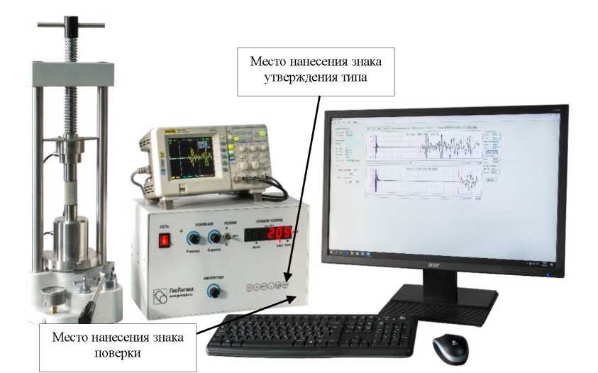 Рисунок 1 - Общий вид, место нанесения знака поверки и знака утверждения типа для установки для изучения упругих свойств керна в атмосферных условиях ПИК-УЗ c осциллографом и устройством для фиксации образцов (пресса) без блока индикации усилия