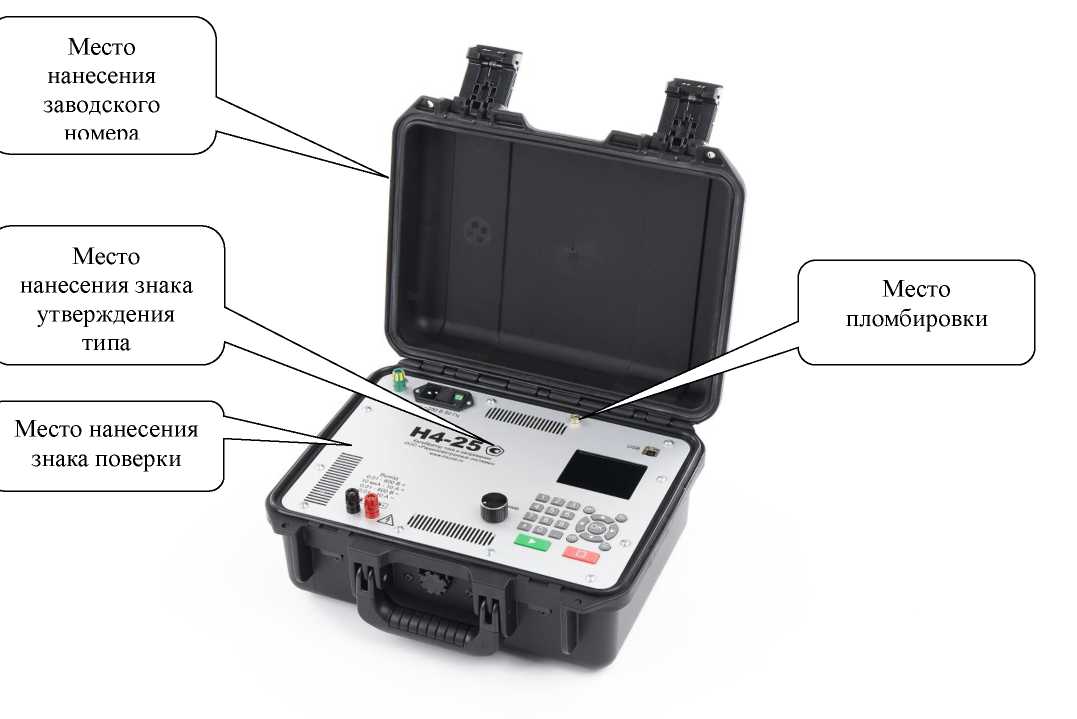 Общий вид калибратора с указанием мест нанесения заводского номера, мест нанесения знака утверждения типа, мест пломбировки и мест нанесения знака поверки приведены на рисунке 1.