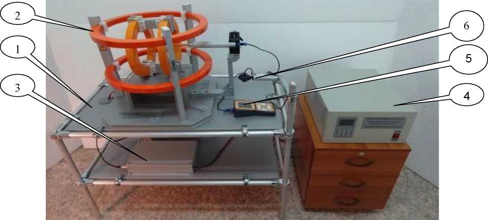 Полеобразующая система содержит две пары взаимно ортогональных КГ, закрепленных на основании. Одна пара КГ расположена вертикально и создает магнитное поле, вектор которого направлен параллельно плоскости рабочего стола (по координате «Х»). Вторая пара КГ расположена горизонтально и генерирует магнитное поле, вектор которого направлен перпендикулярно плоскости рабочего стола (по координате «Y»). К основанию полеобразующей системы крепится фиксатор антенн поверяемых приборов и компаратора. Фиксатор может закрепляться в трех различных положениях на одной из трех направляющих основания полеобразующей системы. За счет этого обеспечивается возможность изменения, при необходимости, ориентации антенн поверяемых приборов по отношению к направлению генерируемого установкой магнитного поля. Полеобразующая система жестко закреплена на столешнице рабочего стола.