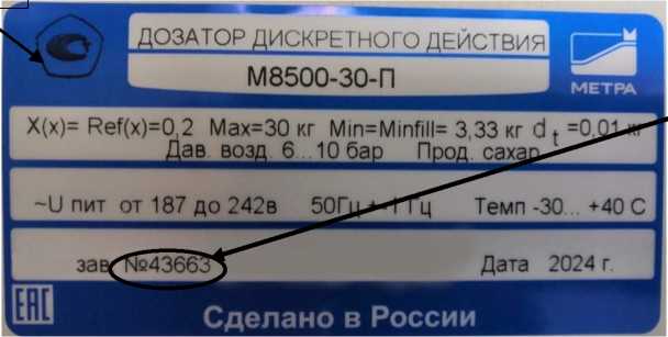Заводской номер в виде цифрового обозначения, состоящего из арабских цифр, и знак утверждения типа наносятся на маркировочную табличку, расположенную на корпусе электрического шкафа дозатора, фотохимическим методом или методом металлографии. Места нанесения заводского номера и знака утверждения типа представлены на рисунке 5.