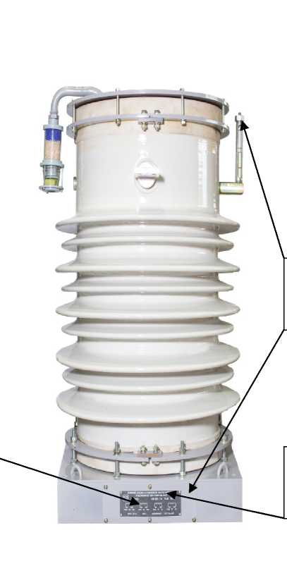 Рисунок 4 - Общий вид трансформаторов тока ТФЗМ-110Б, мест нанесения заводского номера, знака утверждения типа, пломбировки от несанкционированного доступа