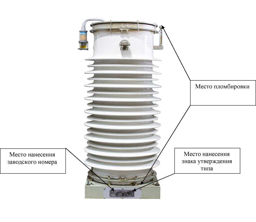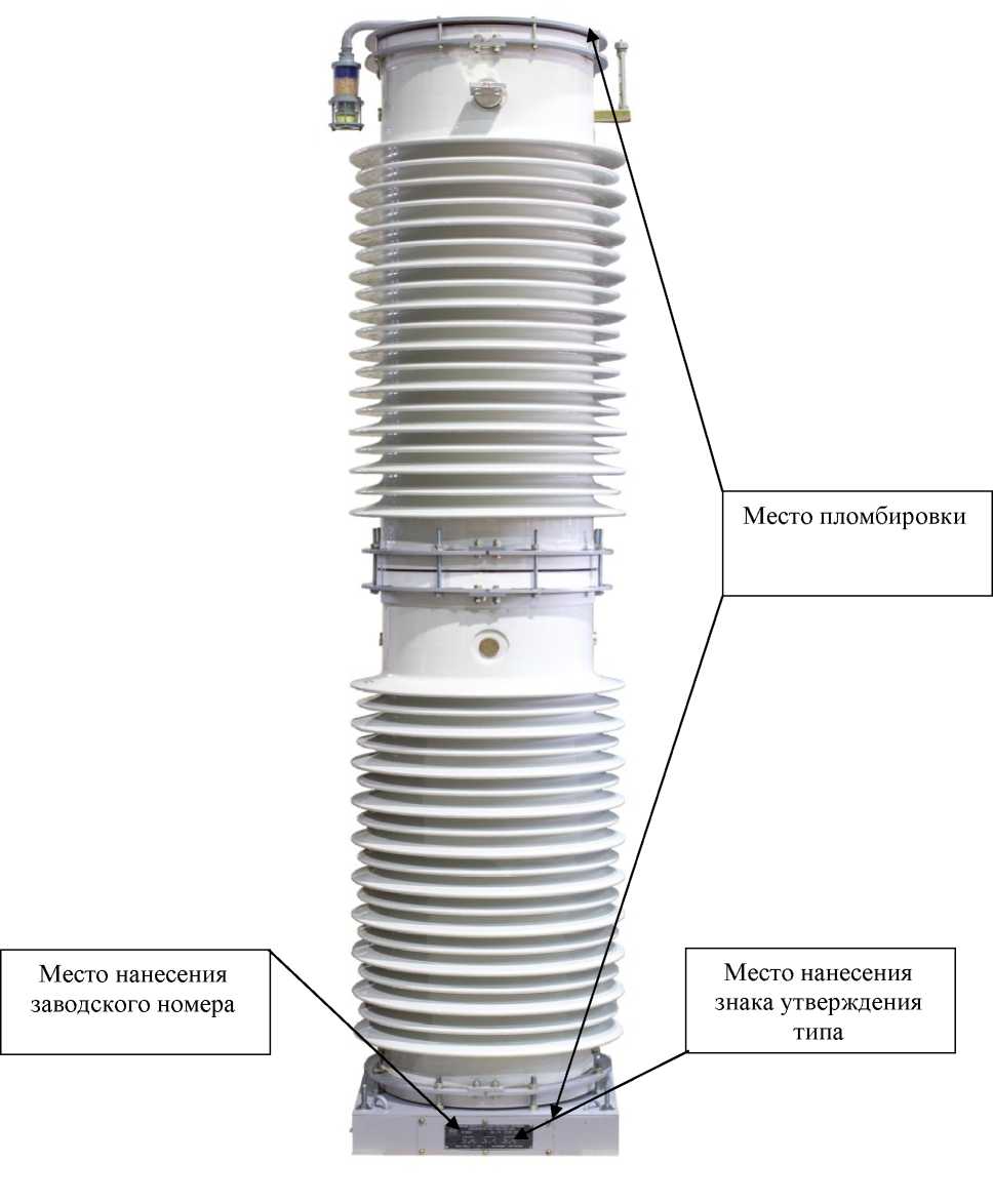Рисунок 5 - Общий вид трансформаторов тока ТФЗМ-220Б, мест нанесения заводского номера, знака утверждения типа, пломбировки от несанкционированного доступа