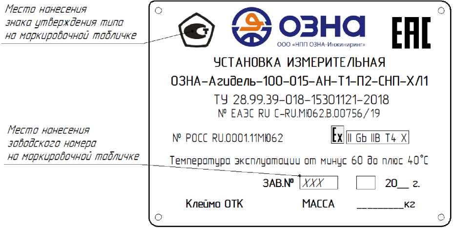 наносится на маркировочную табличку, закрепленную на раме установки методом лазерной маркировки или аппликацией, а также в верхней части по центру титульных листов руководства по эксплуатации и паспорта типографским способом.
