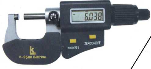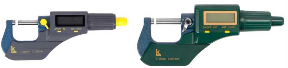 Микрометры с цифровым отсчетным устройством имеют цифровое отсчетное устройство, которое представляет собой жидкокристаллический экран с кнопочным управлением, с помощью которого осуществляется ряд специальных функций, таких как включение или выключение микрометра (ON/OFF), кнопка выбора единиц измерений дюймы или миллиметры (in/mm), кнопка выбора абсолютных или относительных измерений (ABS), кнопка установки предварительного значения (SET) или без нее и др.