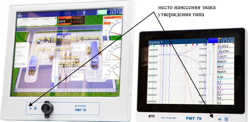 Знак утверждения типа наносится на переднюю панель РМТ 79 и на маркировочную табличку, закрепленную на корпусе РМТ 79, термотрансферным способом. Заводской номер в виде цифрового кода, состоящего из арабских цифр, наносится термотрансферным способом на маркировочную табличку, закрепленную на корпусе РМТ 79.