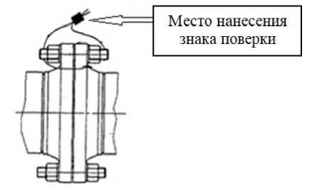 в) Схема пломбировки от несанкционированного доступа, обозначение места нанесения знака поверки на фланцевые соединения средств измерений массы, объема и плотности жидкости установок