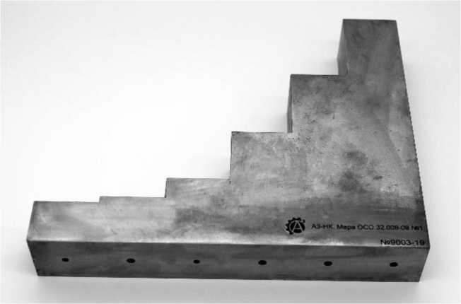 На мере НО-ЛТ.Х.02 искусственные дефекты выполнены в виде плоскодонных отражателей, расположенных на донной поверхности меры по центру ступенек.