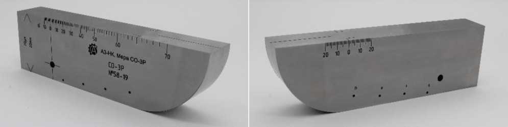 Меры СО-3 (рисунок 3) представляют собой изделие в половину цилиндра. На боковой поверхности меры нанесена шкала, необходимая для определения точки ввода ультразвуковой волны.