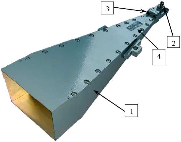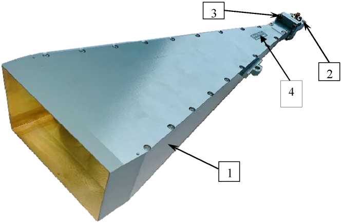 К присоединительному фланцу пирамидального рупора присоединен коаксиальноволноводный переход с соединителями следующих типов: