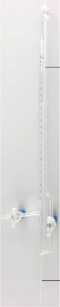 Бюретки представляют собой систему спаянных стеклянных цилиндрических трубок. На трубке меньшего диаметра имеется шарообразное расширение - запасной резервуар. К отводным трубкам припаяны краны. На цилиндрической части трубки большего диаметра нанесена шкала. Выпускаются в одной модификации разной вместимости.