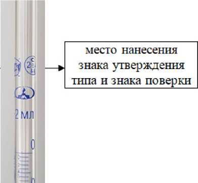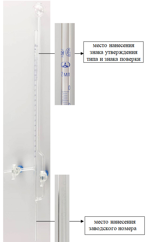 Место нанесения заводского номера, знака утверждения типа и знака поверки на бюретку указано на рисунке 2.