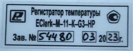 Маркировка прибора выполнена на стойкой к стиранию наклейке и содержит: логотип завода-изготовителя, обозначение исполнения прибора Eclerk-M-11 (01) - 2Pt (T, K, RHT, RHTP, PT) -G2 (G1; G3) - Р (HP), знак утверждения типа, заводской номер по принятой нумерации предприятия-изготовителя в формате не менее 5 арабских цифр, дату изготовления.