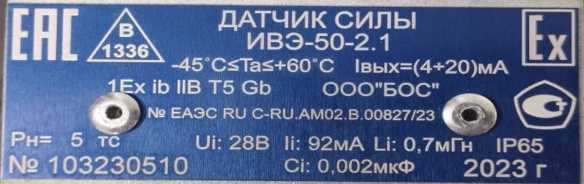 № ЕАЭС RU C-RU.AM02.В.00827/23 (ОИ Рн= 5 тс Ui: 28В li: 92мА Li: 0,7мГн IP65 № 103230510 Ci: 0.002мкФ 2023 г