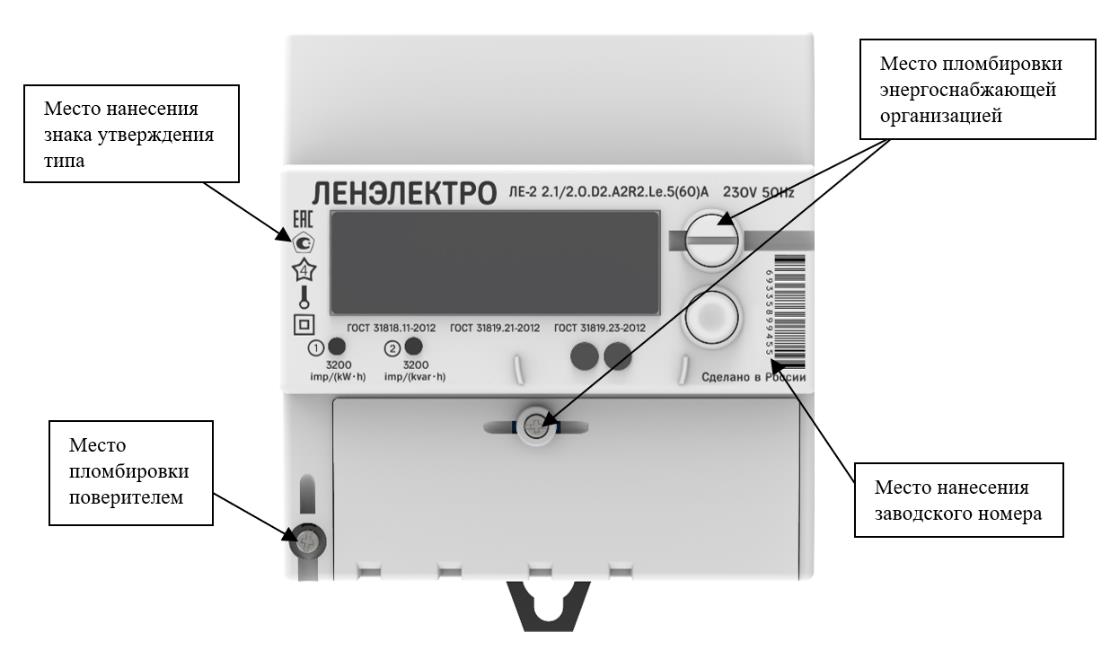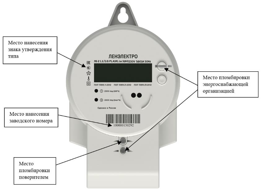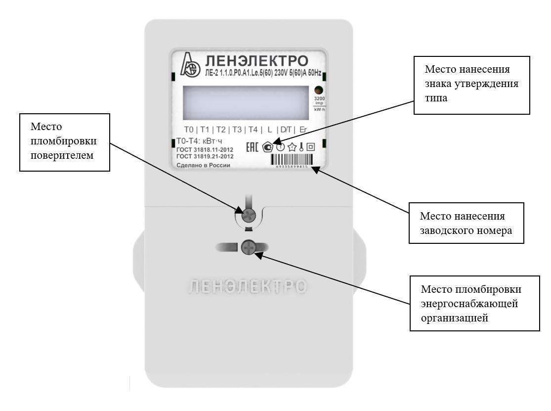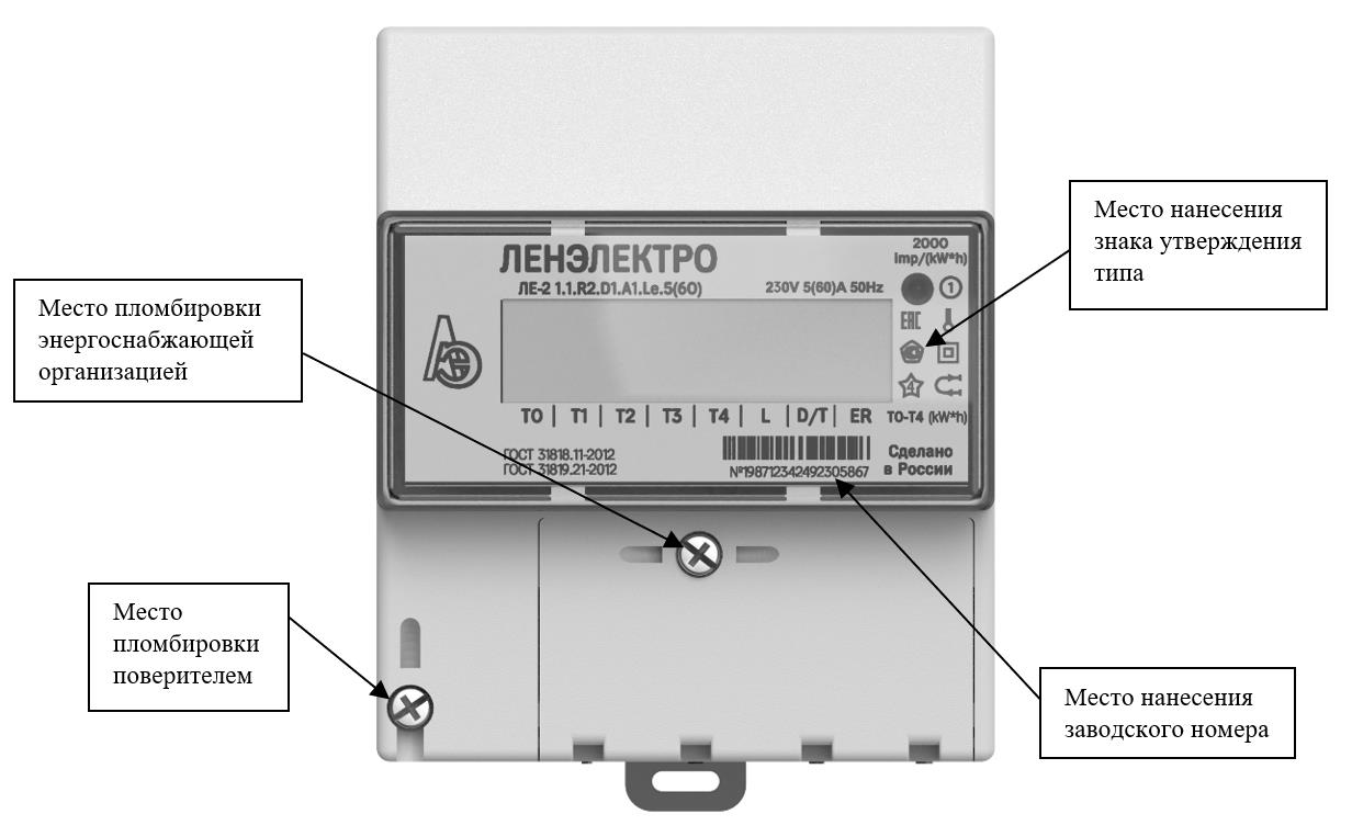 наносится лазерной гравировкой на лицевую панель счетчика или щиток счётчика офсетной печатью (или другим способом, не ухудшающим качества), на титульный лист руководства по эксплуатации и паспорт типографским способом.