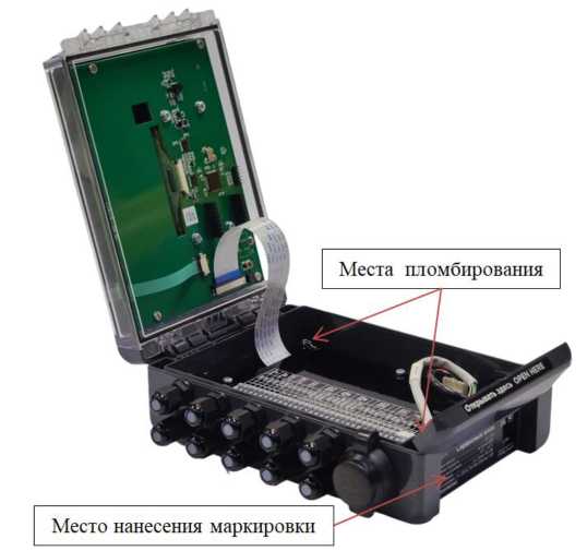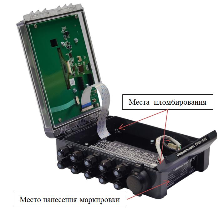 Рисунок 5 - Внешний вид вторичного блока с указанием мест пломбирования и места нанесения маркировки в виде таблички с заводским номером и знаком утверждения типа
