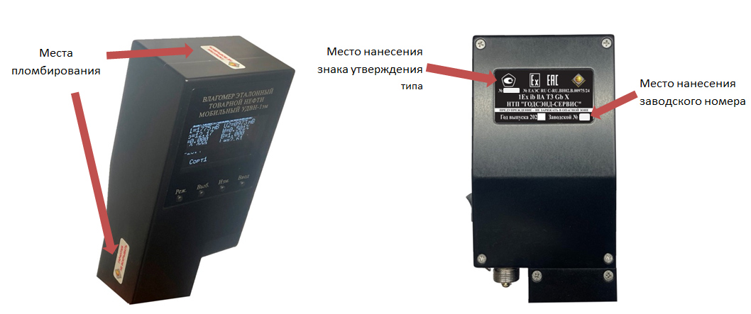 Рисунок 2 - Места пломбирования, нанесения знака утверждения типа и заводского номера влагомеров эталонных товарной нефти мобильных УДВН-1эм